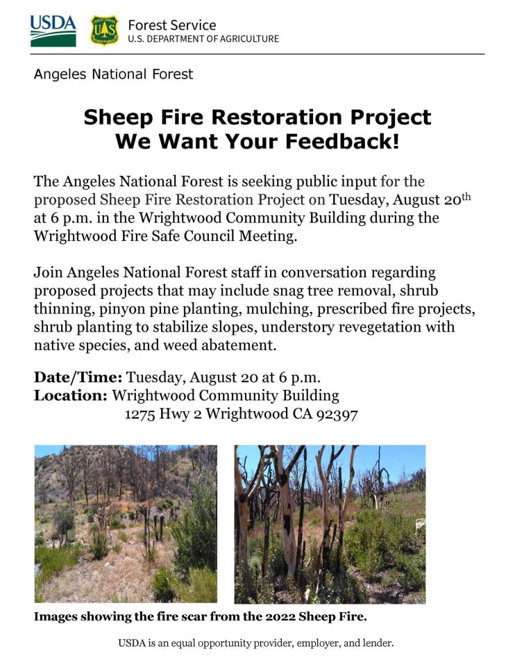 The Angeles National Forest is seeking public input for the proposed Sheep Fire Restoration Project on Tuesday, August 20, at 6:00 p.m. in the Wrightwood Community Building during the Wrightwood Fire Safe Council meeting.