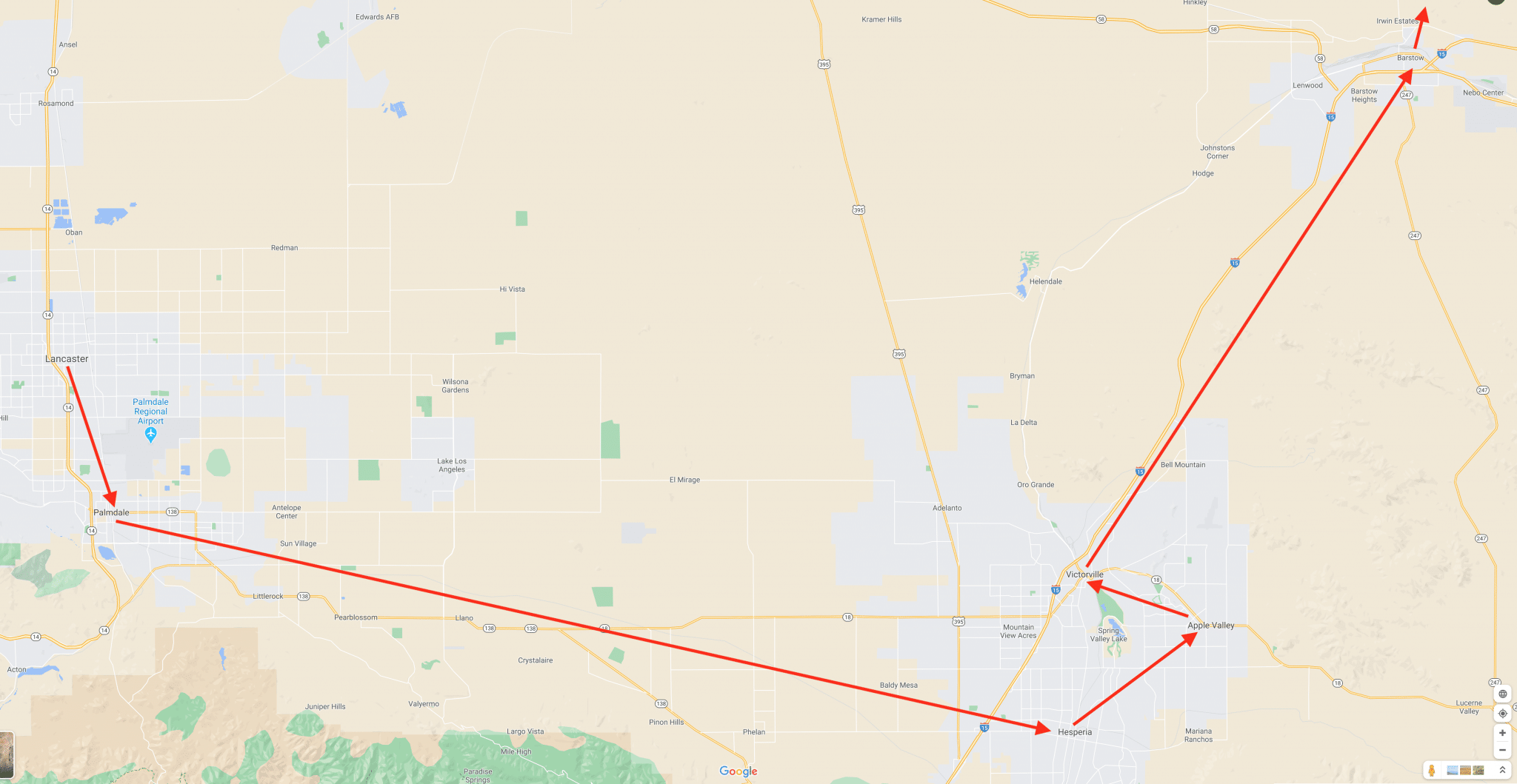 UPDATE: On Saturday, October 10, aircraft are expected to arrive in Victorville between 11:20 am & 12:20 pm, in Apple Valley/Hesperia between 11:25 am and 12:30 pm, and Barstow/Fort Irwin between 11:35 am and 12:55 pm. The live telecast begins at 11:00 am and can be viewed at avairshow.com/live-video/ Below is an updated map as of October 9, 2020.
