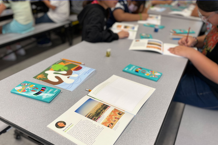 California native and Chicana artist, Michelle Glass, presents to 5th graders at Phelan Elementary that this particular story cloth was created during the pandemic by BIPOC members of her community as an art mural near the Kern River. A story cloth is one way communities record their history and culture by including symbols to tell the story of a particular point in time. Therefore, the story cloth isn’t just art, but it represents the social and environmental justice issues of air quality & water pollution that are happening right now in Kern County. Her community art project, entitled “We Are Here/Estamos Aqui,” took two years to complete, and the story cloths spanned 2500 feet, about the equivalent of 3 football fields. On this day, students at Phelan Elementary will get the chance to create their own story cloth in an art workbook entitled Visitors: An Art & Environmental Stewardship Project provided by local Wrightwood non-profit, Drawing Together.