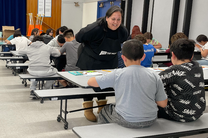 Michelle Glass is not only a contemporary artist but an activist, and her work is focused on bringing communities together through art. During her art assembly at Phelan Elementary, she accomplishes just that by asking students to draw something they love that THEY want to protect. As students draw pictures of their school, friends, family, and even planet Earth, Michelle notices the same connection between the elders in her community and the elementary school students. “I love that they’re sharing and collaborating together. They’re finding things they didn’t know about each other.” Just as Michelle’s elders worked together to create and stitch together the 2500 ft story cloth, the students do the same by sharing what matters to them with drawings and symbols. Most school projects are focused on having an end goal or a letter grade, but Michelle says art is different in that it’s about the process, not the end product. “Creativity doesn’t happen naturally, so when we experience the joy of making art together, the special part of it is making and creating it,” says Glass.