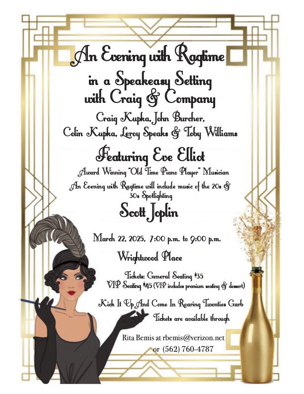 ‘An Evening with Ragtime in a Speakeasy Setting’ will be presented Saturday, March 22, 2025 from 7-9 pm at Wrightwood Place. ‘Ragtime’ will feature award winning old time piano player musician Eve Elliot who will spotlight the music of Scott Joplin along with other composers of this unique and entertaining style of music. Craig Kupka and his combo of musicians, John Burcher, Colin Kupka, Toby Williams, Leroy Speaks, will precede Eve with music of the early 1900’s. Think George M. Cohen, Irving Berlin, etc.
