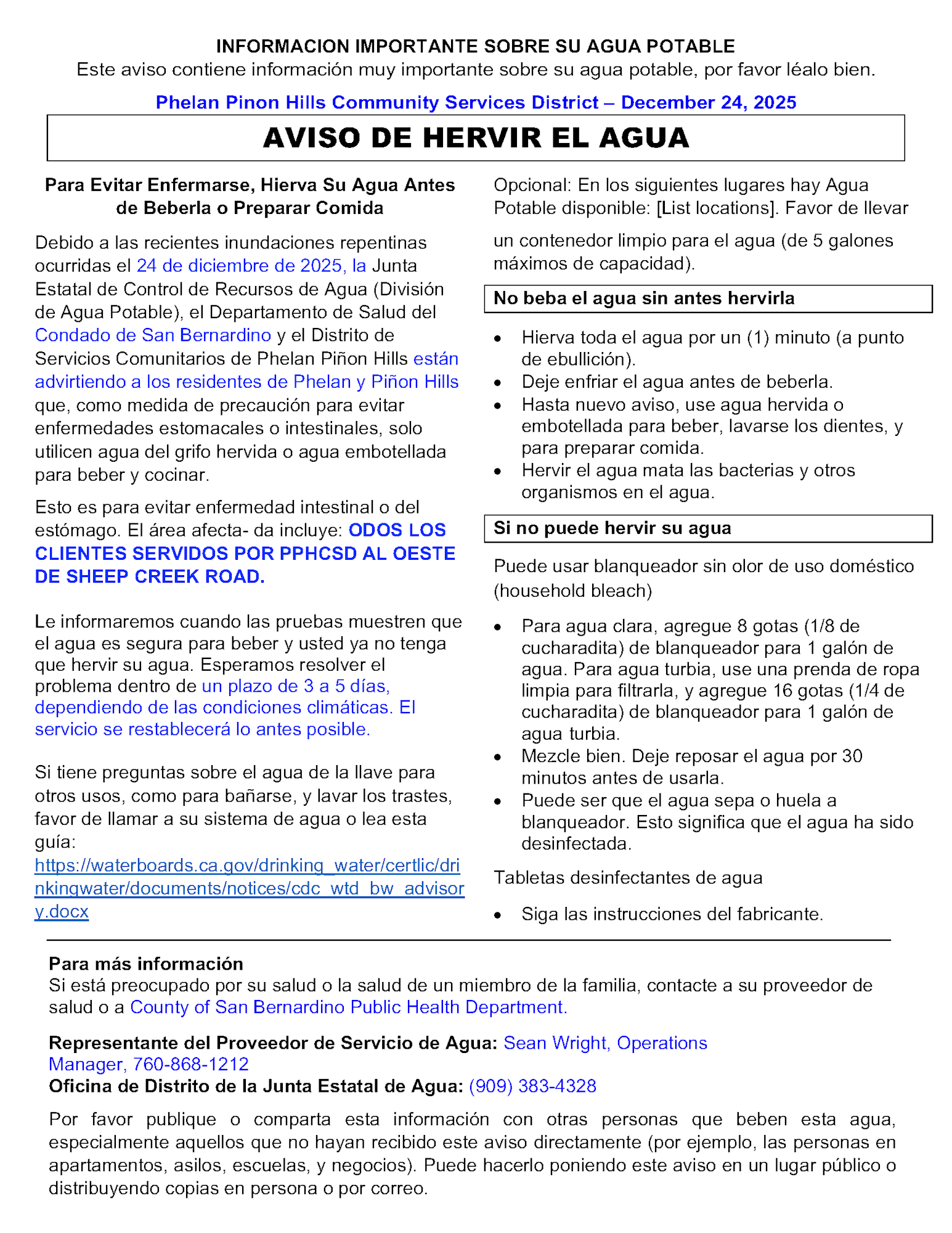 The district is still evaluating whether bottled water distribution will be needed. Cardenas said one challenge is that the Stater Bros. market in Phelan is closed on Christmas Day, limiting immediate access to bulk-bottled water. The district is exploring options and will provide updates if distribution becomes necessary.
