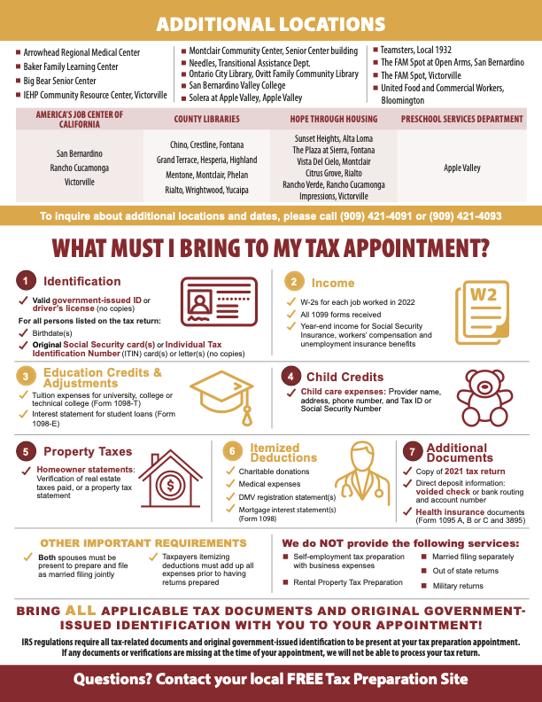 San Bernardino County will help provide free tax preparation and e-filing services for low- to moderate-income taxpayers that earned less than $60,000 in 2022. The County Transitional Assistance Department is partnering with the IRS to provide the Volunteer Income Tax Assistance (VITA) and Earned Income Tax Credit (EITC) program.