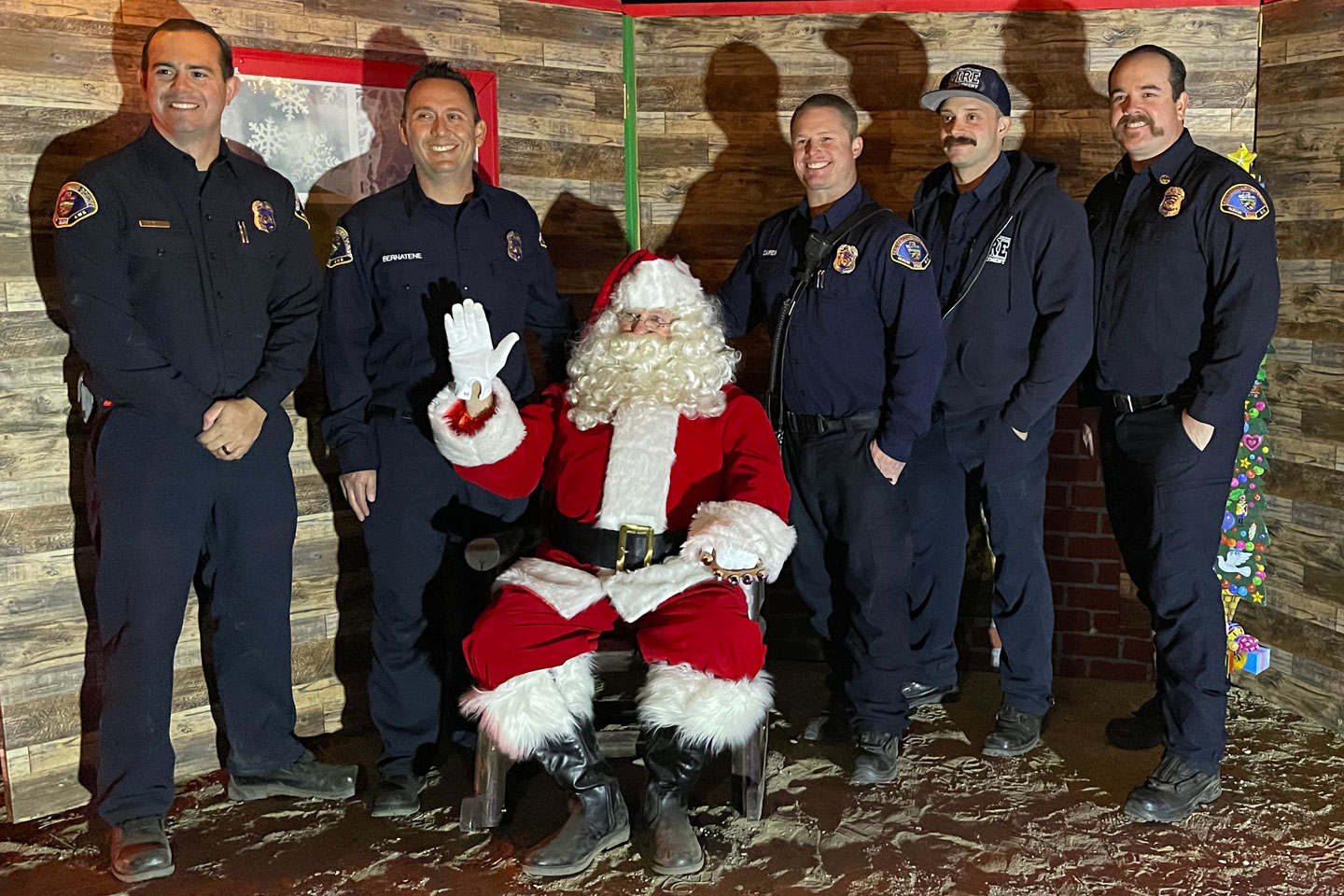Anticipation began to build as the crowd waited for Santa’s arrival. Many became concerned when all of a sudden, the fire engine from County Fire Station 10 pulled into the Phelan Park parking lot with lights flashing. Could this medical emergency thwart the evening’s activities? Not so much. When all at once from the window of the fire engine, a white-gloved hand appeared waving to all that could see! Was it a firefighter? Wait, could it be… Ho! Ho! Ho! sounded from the window, followed by the vision of rosy red cheeks and a bright white beard topped with a red cap. Santa had arrived, not on foot, not by sleigh, but by fire engine escort. All were overjoyed at the sight as Santa made his way out of the engine, greeting excited young ones as he made his way to his Santa’s Cabin, where his chair patiently awaited.