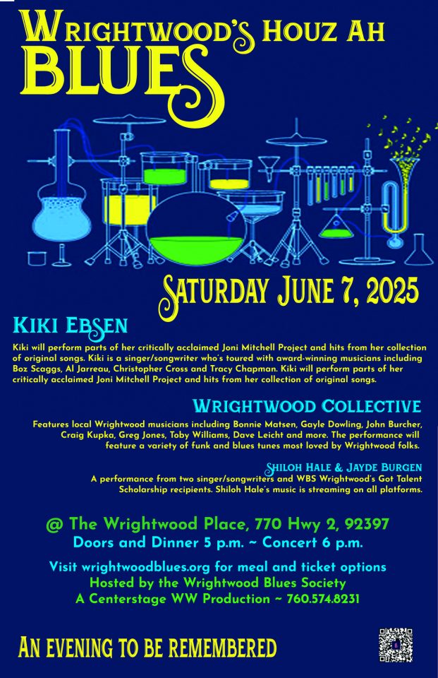 The Wrightwood Blues Society will host its 2025 Houz Ah Blues Concert on Saturday, June 7, from 5 to 9 p.m. at The Wrightwood Place. Headlined by acclaimed vocalist and keyboardist Kiki Ebsen, the event will feature an evening of blues, jazz, folk and Motown performed by both seasoned artists and emerging local talent.