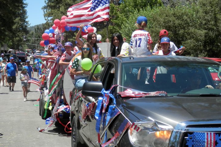 The 2023 11U Wrightwood All Stars lead the Wrightwood Mountaineer Days Parade down Apple Avenue.