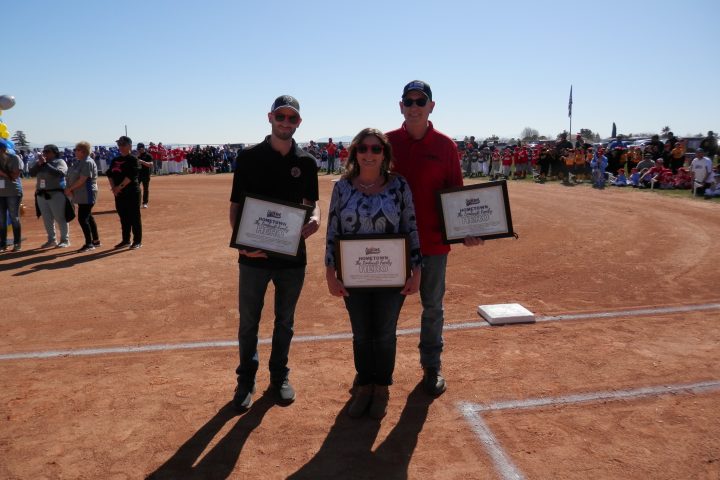 Recognizing their contributions to the Tri-Community, The Lombardi family of Pizza Factory, Paizly Vintage Antiques, and the Ranch Steakhouse in Historic Phelan received “HOMETOWN HERO” plaques to commemorate exceptional service to the community. Also being recognized were Daniel and Elana Flores and the Flores family for their ongoing service to the church and community by allowing them the honor of throwing out the first pitch on Opening Day. After reciting the traditional (since 1950) “Little League Pledge,” The 25 Little League Teams systematically ran the bases in a showcase of baseball fanfare at its best.