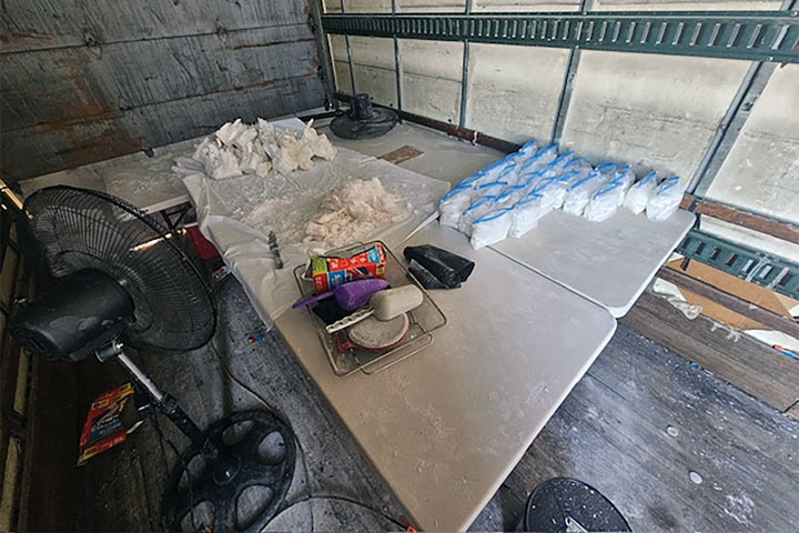 Upon obtaining a search warrant, law enforcement officers searched the trailers, uncovering two AR-style rifles, a handgun, and approximately 88 pounds of methamphetamine. Additional evidence consistent with the manufacturing of methamphetamine was also found.