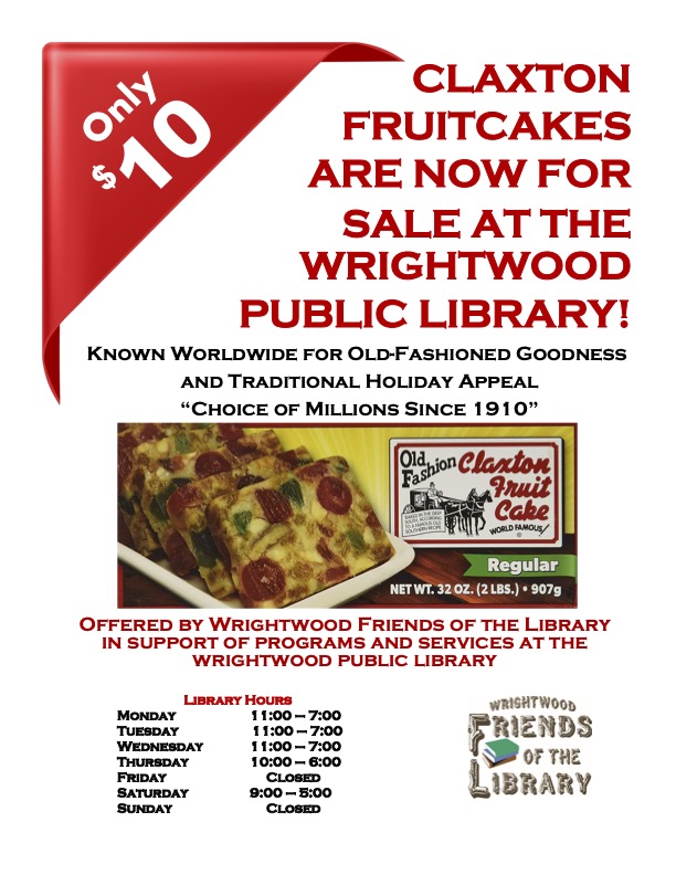 The Friends of the Wrightwood Library will hold a Fruit Cake Fundraiser beginning Nov. 4 during regular business hours. Each loaf will be available for $10. Families are also invited to Family Game Time on Saturday, Nov. 9, at 11:30 a.m. The event will include board games, puzzles, and group games for all ages.