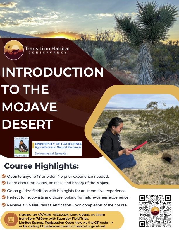 Transition Habitat Conservancy strives to provide education about the fragile and inspirational nature of our desert plants, animals, and ecosystems to connect people to nature. We are proud to be the first and only UCANR partner to offer a Mojave Desert-specific California Naturalist course, which will be offered for the first time in March 2025.