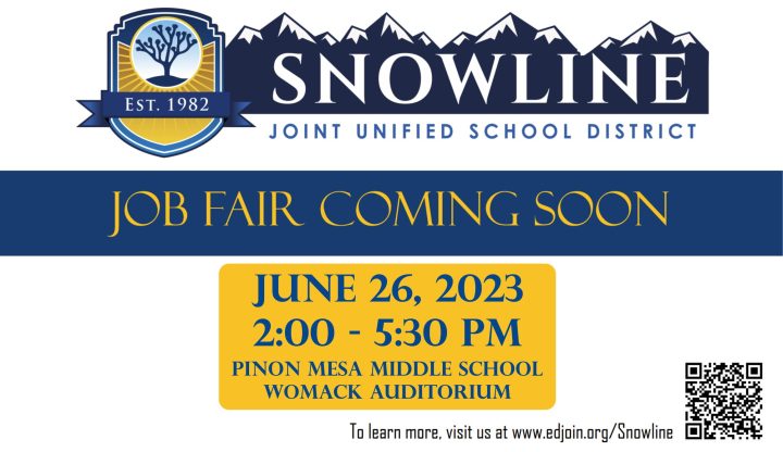 The school district will be hosting a job fair on Monday, June 26, from 2 pm to 5:30 pm at Pinon Mesa Middle School at 9298 Sheep Creek Road in Phelan. A list of open positions and job postings can be viewed online at https://www.edjoin.org/snowline#