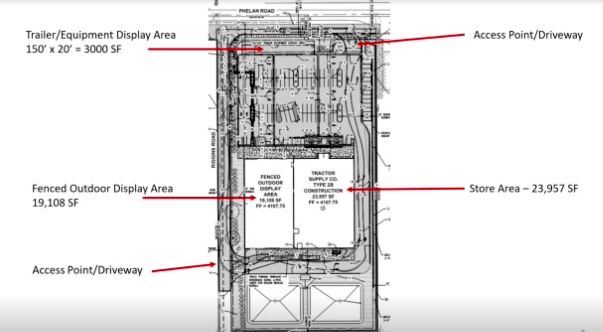 The building will stand about 31 feet tall, just under the 35-foot height maximum allowed for commercial zoning. A site plan presented at the meeting showed two access points: one directly from Phelan Road and another from an extension of Riggins Road that will be built along the west side of the property. The project also includes new curbs, gutters and sidewalks, and stormwater will be managed through underground infiltration systems located behind the store. County staff noted that the store’s parking plan exceeds requirements, providing 98 spaces where 96 are required, and that landscaping will cover more than a quarter of the property.
