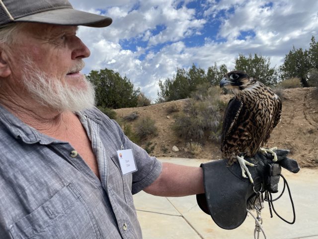 Falconer Steve Shaw was also in attendance with his two-year-old Peregrine Falcon, Pauline. Shaw uses his falcon to educate others on the importance of raptors in the desert, especially the native Prairie Falcon, which is essential to the desert ecosystem. Shaw provided an informative talk about falconry with Transition Habitat in the spring and said he enjoys partnering with them, stating, “I believe in what they are doing, and they actually let people on their lands.”
