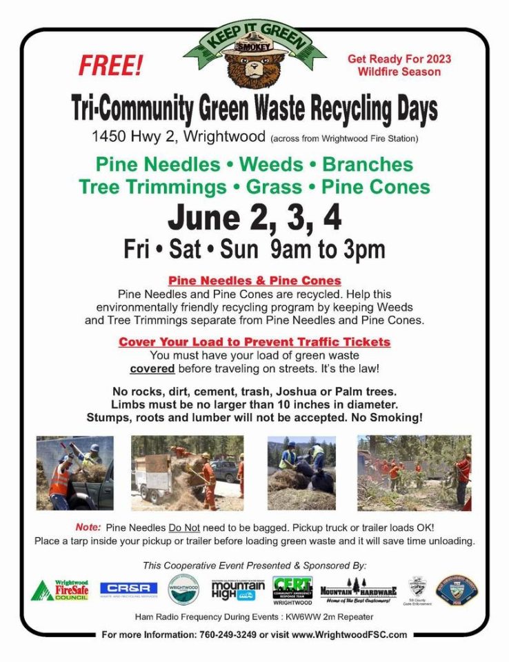 The Wrightwood CSD works with the Fire Safe Council which offers two green waste drop-off sites per year to help with pine needles collection. The free recycling days will take place on Friday, June 2nd through Sunday, June 4th from 9am to 3pm. Pine needles, weeds, branches, tree trimmings, grass and pine cones can be dropped off for free at 1450 Hwy 2 in Wrightwood, across the street from the Wrightwood Fire Station. For more information about this event visit www.wrightwoodfsc.com or call 760-249-3249. The next green waste event takes place in September.