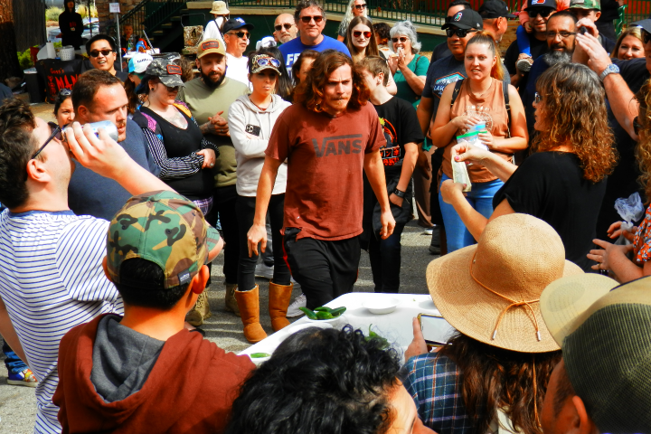 Timed perfectly, as soon as all the chili bowls were cleared away, it was time for the infamous “Jalapeno Challenge.” The one lone table in the middle of the plaza became surrounded by spectators and last-minute entrants who first devour one Jalapeno pepper in one minute, then pound as many as they can in two minutes’ time. Imagine hundreds of screaming and cheering pepper–eating fans spurring on the contestants to go past the pain threshold and ingest the burning Jalapeno to ½ an inch of the stem. Dakota Robson and Shane Ricci shared the win and the bragging rights for this contest with six chilis each! When asked if he would do it again, Corporal Dakota Robson replied, “Definitely not!” The same question was asked to co-winner Shane as he chugged on a half-gallon of cold milk; he replied, “Oh Yeah!” wiping his brow with his sleeve.