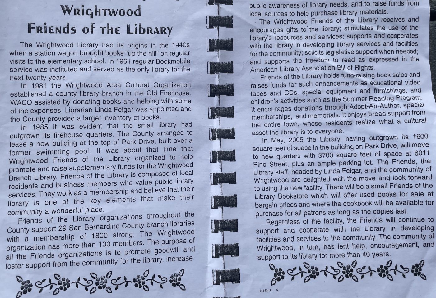 History of the library was provided by the Wrightwood Friends of the Library Cookbook (circa 2005)