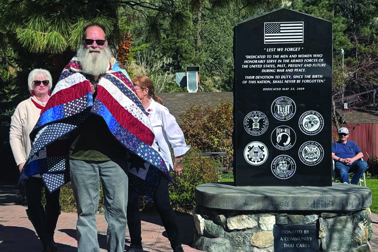 This year’s ceremony also featured the newly formed Wrightwood chapter of Quilts of Valor, established in February 2025. Representatives Marian Hall and Diane Armstrong presented handmade quilts to local veterans, including Ron Jacque, Michael LaFever, Cody Siquedo/Young, Salvatore Gallardo, Chris Armstrong, and Goward Sunderland. Quilts of valor began in 2003 when a mother of a soldier was inspired by a dream while her son was deployed in Iraq. In the dream a quilt transformed soldiers’ despair into hope, leading to the idea that quilts equal healing. She began presenting quilts to Walter Reed Army Medical Center. Quilters from all over the country then began sending their handmade quilts, and today their mission to provide quilts that offer comfort and healing to service members and veterans touched by war.