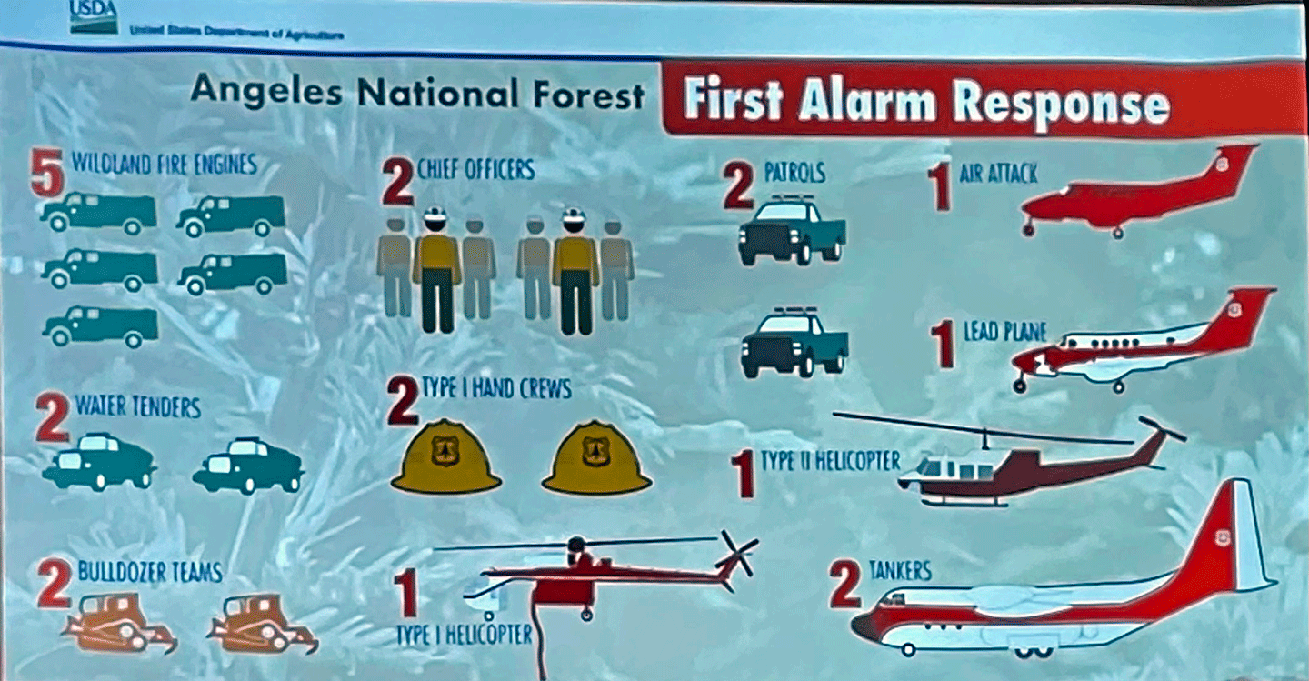 Bob Garcia from the Angeles National Forest began the presentation by showing a map of the initial fire attack that occurred on June 11th. Garcia emphasized the robust mutual aid put toward the Sheep Fire, which included an estimated 200 firefighters who responded on the first night, then doubled the next morning to 400 and was up to 700 by the end of day two. Garcia said they were “Thankful to have the resources available at that time, compared to last year.” According to the Cal Fire website, during the summer of 2021, “…the state of California was facing “unprecedented fire conditions.” Chief Shane Littlefield of Cal Fire validated that the response to the Sheep Fire was vigorous due to the unified command with Cal Fire, Angeles National Forest, and San Bernardino County Fire all working together. Littlefield stated, “Multi-agency responses are well coordinated and well thought out.”
