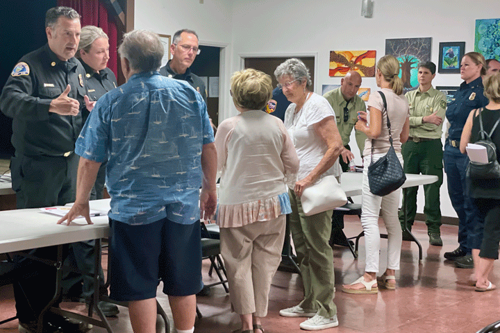 While the initial response to the fire was presented as vigorous, it left some of the community wondering why it led to the destruction of hundreds of acres. Michelle Steinmann of Wrightwood asked specifically how the fire jumped the wash and if there was anything that could have been done differently to prevent it. Steinmann’s husband is a developer for the Pacific Crest Estates, and their land located off Wright Mountain Rd. was directly affected by the fire. Steinmann stated, “The wash is the biggest fire clearing, and I’m puzzled as to how the fire could have spread.” The panel unanimously agreed that fires are unpredictable, and the weather is ultimately the driving force. Chief Littlefield explained the complexities of vegetation fires and how flammable piñon junipers can be. As to what could have been done differently, Littlefield stated, “The response [to the fire] was appropriate and, in my opinion, over-exaggerated.” Ben Smith of the Wrightwood Fire Safe Council also mentioned that a major thing the community can do to prevent the spread of fires is to manage defendable space. This includes clearing weeds, picking up pine needles, and managing trees on your property. Smith stated, “Do your part as well. Don’t leave it all up to these guys […] It’s not just this group; it’s up to the town.”